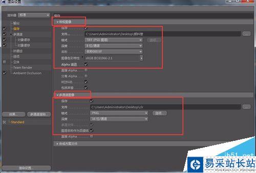 6、設置完成后,打開渲染設置(快捷鍵是ctrl+B),然后設置要渲染圖像的大小,文件格式是否帶有alpha通道等信息,主要的是設置多通道渲染的保存文件路徑,文件格式(盡量不要使用默認的photo格式要是深度不夠的話容易渲染出全黑的圖片)。