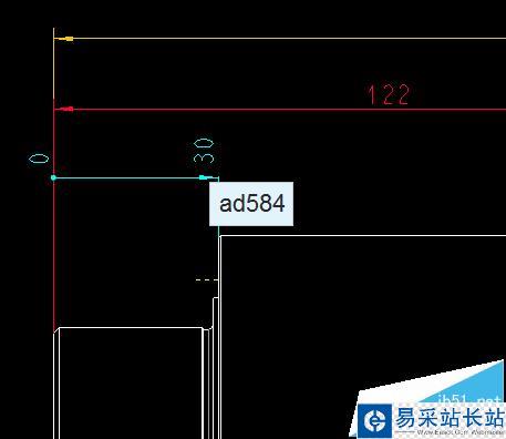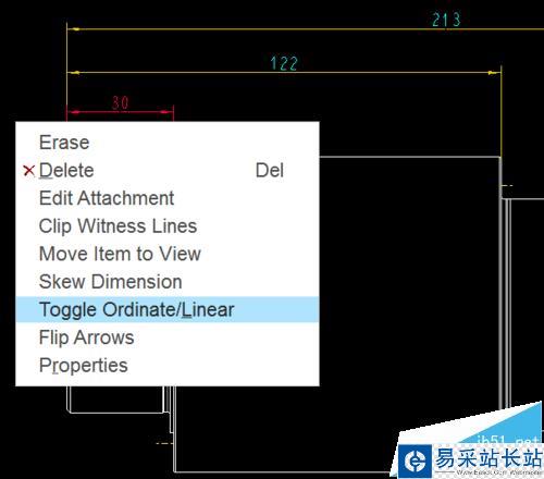 6、選擇尺寸“122”,在彈出的菜單中選擇“Toggle Ordinate/Linear”,然后選擇尺寸“30”,而不選“WitnsLine”,即可生成“122”的坐標尺寸