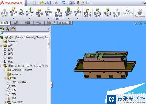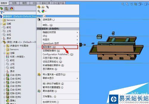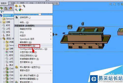 6、在右邊的設(shè)計(jì)樹中床身組件點(diǎn)擊右鍵,選擇解除爆炸