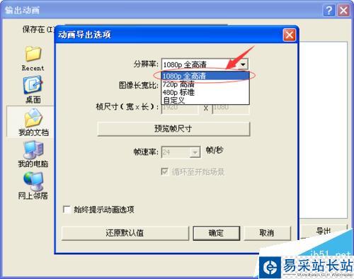 5、再在選項中選擇分辨率,我一般選1080,也可以自己設置,選自定義。