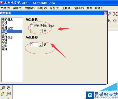3、到“窗口-模型信息-動畫”中設置,允許頁面過渡不選,場景延時選0秒。如圖