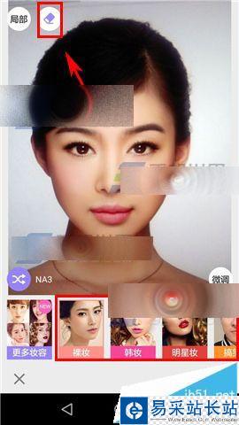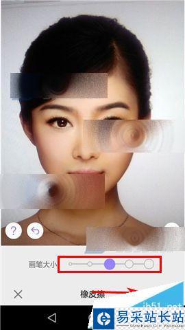 2)根據需要選擇下方【妝容】,然后點擊左上角【橡皮擦圖標】。選擇橡皮擦大小,然后在照片中涂掉你需要的妝容。完成后點擊右下角【勾】即可。(如下圖)(如下圖)