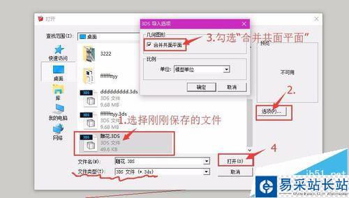 7、打開草圖大師,點擊“文件”-“導入”,文件類型選擇“.3ds",選擇剛剛保存的文件,點擊”選項“勾選”合并共面平面“,點擊”打開“,如圖所示
