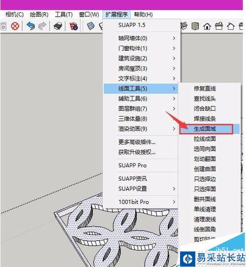 9、如果導入后的物體,沒有生產面,點擊”擴展程序“-”線面工具“-”生產面域“,然后刪除不要的面,再進行推拉