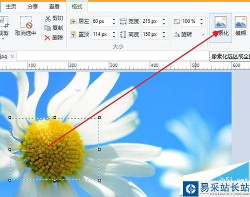 4、選擇這一朵黃花,測(cè)試將其打上馬賽克,框選出一個(gè)矩形區(qū)域,區(qū)域包含這朵花。然后點(diǎn)擊菜單欄上面的“像素化”