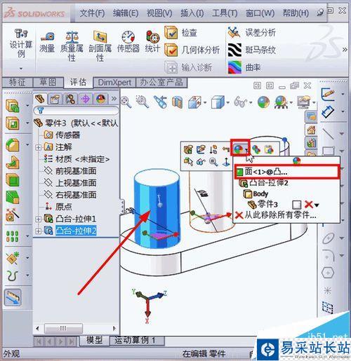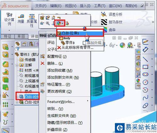 6、下面準備將圓柱面下面的特征染成綠色,在設計樹中選擇“凸臺拉伸”,右鍵,選擇外觀,再選擇“凸臺拉伸”,如圖所示