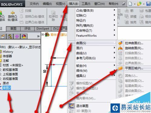 1、如圖所示:選擇草圖,點擊“插入”——“曲面”——“平面區域”。然后可以看到草圖區域已經變成灰色的平面區域了。