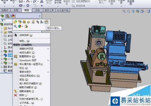 4、現在我們需要讓子裝配體在總裝配體中也能夠移動。我們打開總裝圖,在設計樹中選擇子裝配體,并點擊右鍵,找到零部件屬性