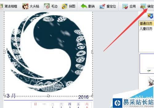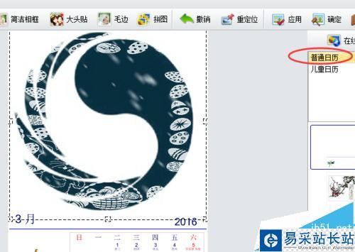 3、選擇普通日歷,在底下出現(xiàn)日歷模板,挑選一個(gè)自己喜歡的類(lèi)型,可以拖動(dòng)控制點(diǎn)改變圖片大小,也可以移動(dòng)圖片位置,讓相框和圖片比較協(xié)調(diào)。還可以進(jìn)行旋轉(zhuǎn),透明度和蒙版等操作。