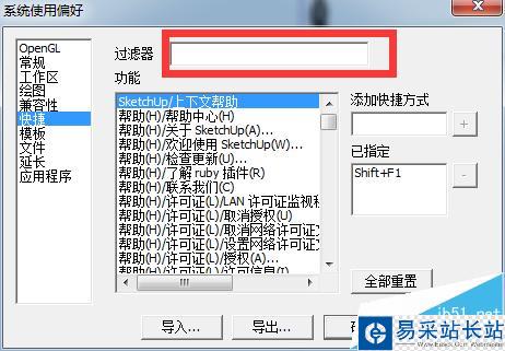3、系統跳出設置窗口,找到“快捷”一項,上方“過濾器”中可以通過關鍵字來搜索想要的快捷鍵全稱。