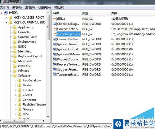 注冊表編輯器的左邊依次雙擊打開以下文件夾:HKEY_CURRENT_USER/Software/Mindjet/MindManager/15/Spelling Checker。在注冊表編輯器的右邊找到DictionaryFolder,雙擊。