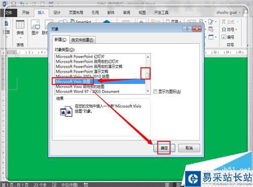 3、進入到對象插入操作中,拉動右邊的滑條,找打“microsoft visio繪圖”,選中它,然后點擊“確定”。