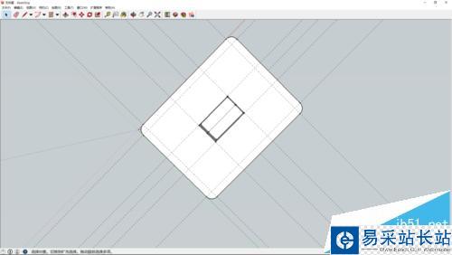 1、使用矩形工具繪制一個(gè)矩形平面,再使用拉尺工具拉出幾條參考線以便倒角,如圖倒角。