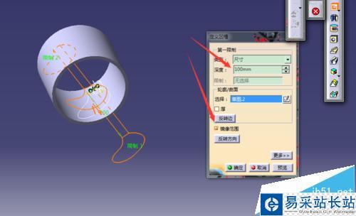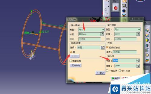 3、選擇凸臺,經(jīng)行拉伸,長度100,厚度1為5,得到一個實體管,然后我們從這個實體管上截取一部分作為螺旋槳的葉片。
