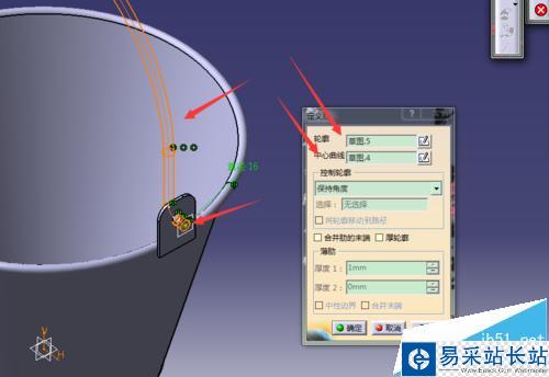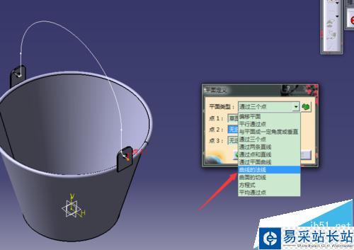 5、繪制水桶梁。用到肋的命令;選擇YZ平面,進(jìn)入草圖,選擇輪廓繪制一條圖示曲線,突出草圖,一繪制的曲線一端的點(diǎn)創(chuàng)建一個(gè)平面,選擇曲線的法線。