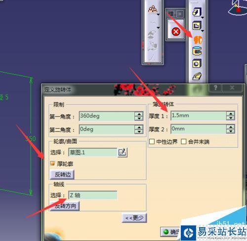 3、把輪廓線進(jìn)行約束;退出草圖,選擇旋轉(zhuǎn),旋轉(zhuǎn)軸為Z軸,厚度1為1.5mm.確認(rèn)。