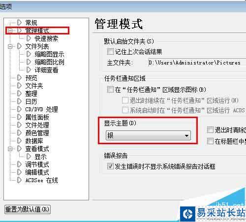 2、在選項(xiàng)中選擇管理模式,右側(cè)顯示主題下拉框中選擇銀色,點(diǎn)擊確定軟件界面馬上就換成銀色了!