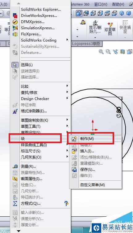 4、單擊“工具”菜單下的“塊”,在“塊”子菜單欄中,單擊“制作”按鈕。(注意:此過程不要退出草圖)