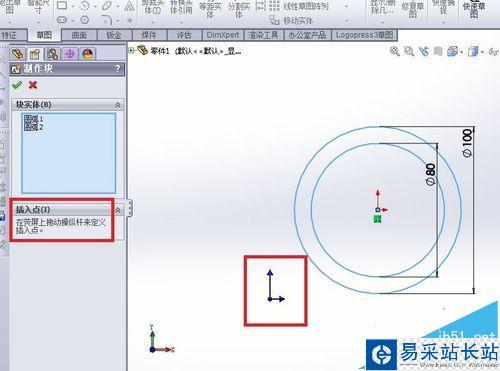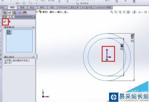6、單擊“插入點”并拖動藍色坐標系到合適位置,作為插入時的基準點,完成后單擊對號按鈕,并退出草圖。