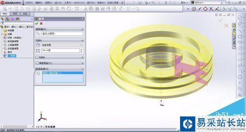 3、然后點擊旋轉命令,旋轉時注意了,中心線為旋轉軸線,所選輪廓為局部范圍,旋轉的角度則為360°點擊打勾確定。