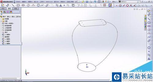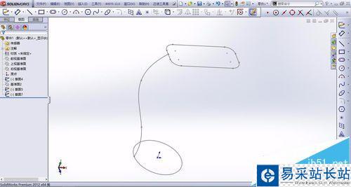 6、和步驟5一樣,在前視基準(zhǔn)面上繪制另外的草圖,繪制一條曲線,與上視基準(zhǔn)面的草圖和新建的基準(zhǔn)面相連,如下圖所示。