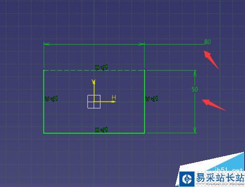 3、選擇YZ平面,也可以選擇其他平面,進入草圖編輯器,繪制一個80*50的長方形,標注尺寸,把一條長邊設置為構造線。