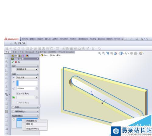 5、有時候我們只是需要利用這個草圖當中的一部分,(所以開始要先創建有2個以上封閉環的草圖),現在我們對拉伸操作時默認選取的草圖輪廓進行清除。點開對話框中所選輪廓右側的向下的雙箭頭,在現有輪廓上右擊,點擊消除選擇。