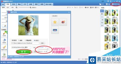 3、點擊右上角的”保存與分享“按鈕,在彈出的對話框里調節”畫質“這時圖片的大小會隨之改變,調至合適的大小,然后點擊”保存“按鈕,這時就會發現圖片的大小改變了。
