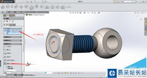 2、先移動螺母到螺栓的前面,方便約束配合,首先配合螺母孔中心與螺栓圓柱中心同軸,再在高級配合里面選取螺旋配合,分別選取內外螺紋面。如圖所示