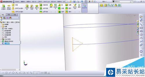 4、在螺旋線的起點或者終點位置處繪制一個三角形或者等腰梯形,為螺紋的形狀。繪制完畢退出草圖,然后點擊掃描切除,輪廓為三角形,路徑為螺旋線。