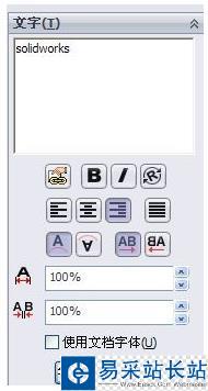 4、在文字編輯框中輸入要輸入的文本,本文需要輸入的是“SolidWorks”,所以下面在文字編輯框中,我輸入了“SolidWorks”,文字編輯框是調(diào)節(jié)文字用的,可以改變文字大小、文字間距、文字類型等等;