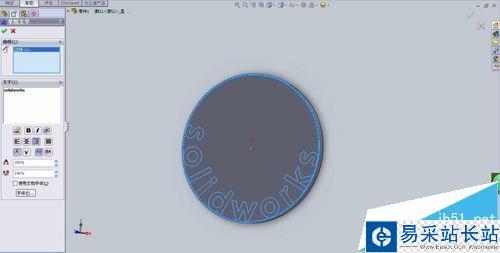 2、首先我們選中模型的前平面,按上述三種方法擇其一選擇【文字】,在模型上創(chuàng)建文本“SolidWorks”,使其附在圓周上
