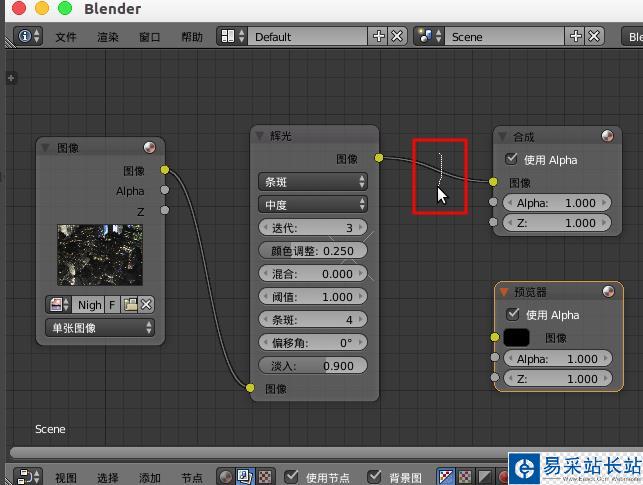 6、“按住shift”,然后“鼠標左鍵”,在“輝光”與“合成”的連接線上滑動添加“連接點”,然后連接到“預覽器”。