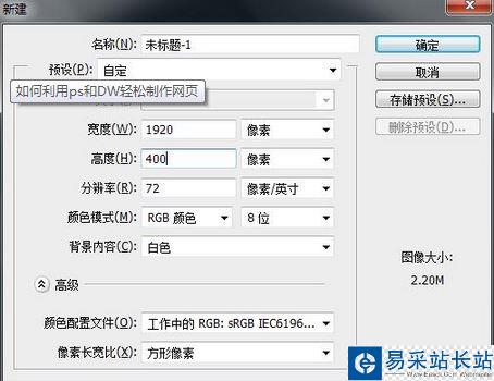 我們需要先制作背景圖片。也就是網(wǎng)頁背景那塊藍色的部分。我們需要單獨做出來。