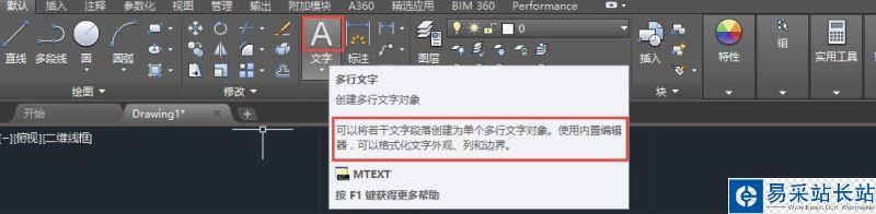 1、多行文字的命令是MTEXT,我們在菜單和工具欄中也能找到多行文字的命令或按鈕,但通常我們都直接輸入多行文字的快捷鍵T來書寫文字。