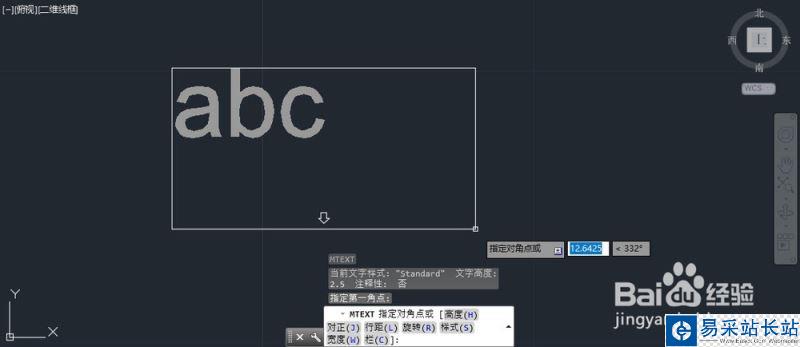 2、輸入T,回車,軟件會提示確定多行文字的第一個角點,并同時顯示一個樣例文字,默認為abc,讓我們可以看到當前文字樣式的效果。