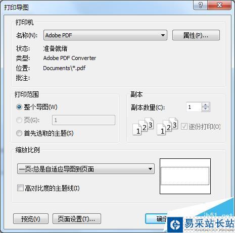 3)選擇打印機為Adobe PDF(也可以是其他安裝的PDF虛擬打印機),然后根據個人需求,設置“縮放比例”及其他。