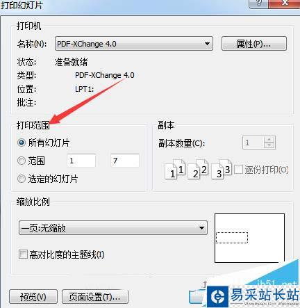 2、在打印對話框中,打印范圍下面,選擇所有幻燈片、范圍或選定的幻燈片;