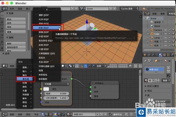 7、shift+a選擇“著色器”--“折射BSDF”添加一個折射BSDF。