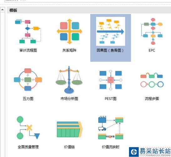 2、選擇商務(wù)圖中的模板“因果圖”,并點擊“創(chuàng)建”圖標(biāo),如下圖所示: