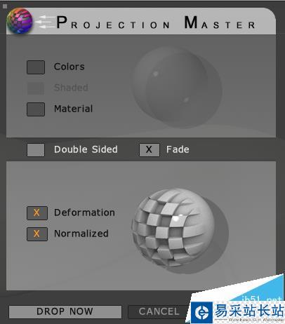 3、點(diǎn)擊“Projection Master”按鈕,彈出投影大師設(shè)置面板,取消默認(rèn)開(kāi)啟顏色的選項(xiàng),勾選“Deformation變形”按鈕。當(dāng)繪制模型的表皮細(xì)節(jié)時(shí),可以激活 “Normalized”選項(xiàng)和“Fade”選項(xiàng),最后點(diǎn)擊“DROP NOW”按鈕,將模型脫落。此時(shí)的模型已經(jīng)被脫落到畫(huà)布上了,下面對(duì)模型進(jìn)行細(xì)節(jié)的繪制。