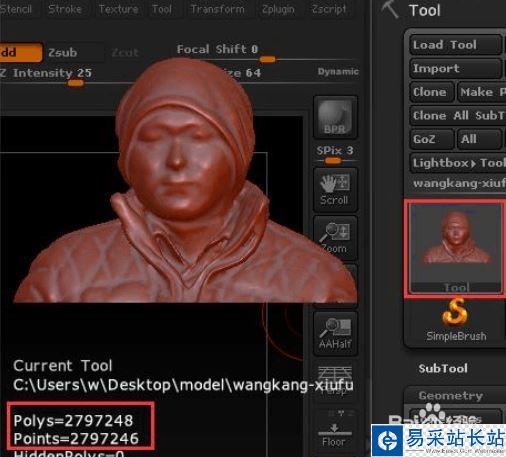 5、簡化導(dǎo)出:模型導(dǎo)出之前,我們先簡化一下。點擊菜單欄Zplugin>Decimation Master>>Pre-process Current[插件>簡化大師>簡化當前],預(yù)計算當前的模型;再設(shè)置模型要簡化成原來的百分比;最后點擊Zplugin[插 件]Decimation Master[簡化大師]Decimate Current簡化當前計算當前模型。再觀察模型的點面信息,將模型的點數(shù)簡化到幾萬之內(nèi)就可以了。最后效果如圖。