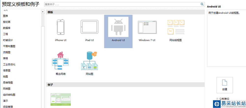 2、在”預(yù)定義模板和例子“中選擇”線框圖“, 選擇”Android UI“,點(diǎn)擊”創(chuàng)建“圖標(biāo),如下圖所示: