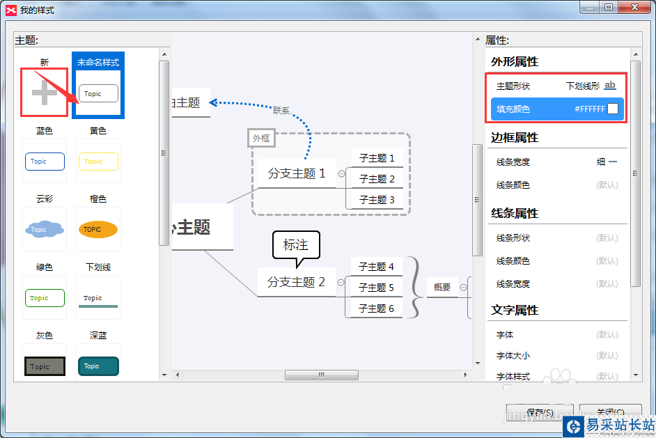 3、在打開的“我的樣式”窗口中,單擊“新”圖標,新建一個“未命名樣式”,你可以對其進行命名,本文命名為“下劃線0”,將外形屬性中的“主題形狀”設置為“下劃線形”,填充顏色為“白色”,其他屬性的設置,你可以根據(jù)要求自行設置,設置完成后單擊保存即可。