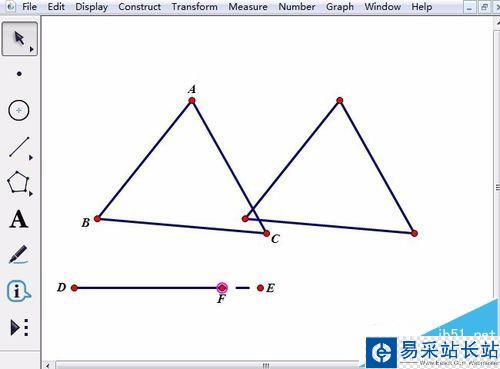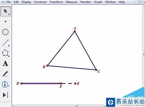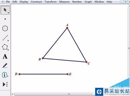 1、繪制△ABC和線段DE。打開幾何畫板,選擇左側(cè)側(cè)邊欄“多邊形工具”,在畫板空白區(qū)域繪制△ABC;選擇左側(cè)側(cè)邊欄“線段工具”,在畫板上任意畫一條線段DE。