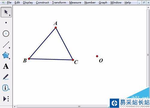 1、打開幾何畫板,使用左側(cè)“線段工具”繪制任意三角形ABC,然后使用“點工具”在三角形外繪制任意一點O,雙擊點O,標記為旋轉(zhuǎn)中心;;