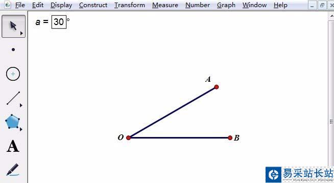 2、繪制∠AOB,使其度數為30度。選擇“線段直尺工具”,在畫板上作一條線段OB。雙擊點O,標記為旋轉中心,選中線段OB和點B,執行“變換”——“旋轉”命令,在彈出的對話框點擊確定,這樣得到了∠AOB。