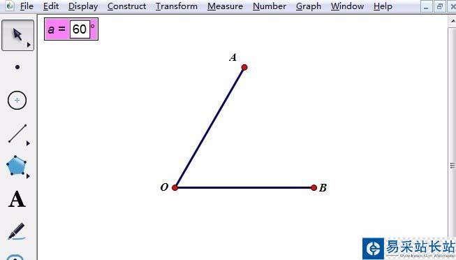 3、改變∠AOB的度數。選中角度參數a,利用“+”、“—”號調整參數的大小,就可以調整∠AOB的大小,∠AOB的大小隨著參數的變化而變化。
