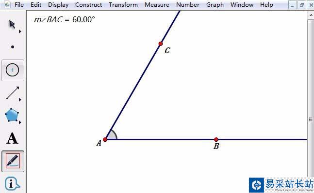 3、標記角。使用幾何畫板標記工具,將光標放在A點處,按下鼠標不放向角內部拖動將角進行標記。經過度量,∠BAC=60°,正是所要求的角。