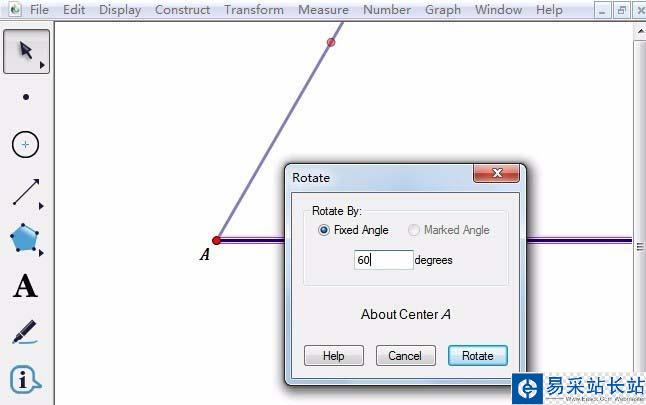 2、構造60度角的邊AC。雙擊點A標記為旋轉中心,選中點B和射線AB,選擇“變換”——“旋轉”,在話框中輸入角度60,如下圖所示,然后點擊“確定”,就得到了角的另一邊。
